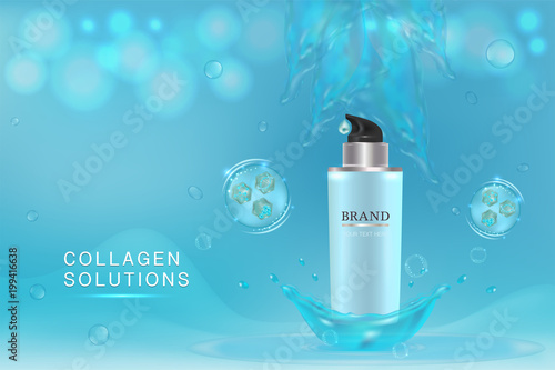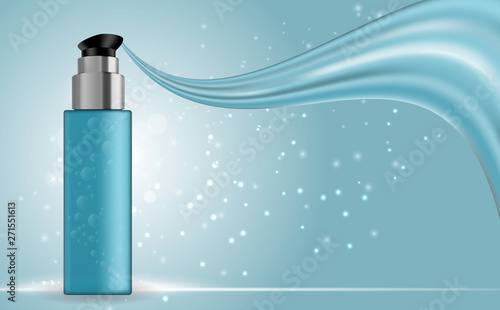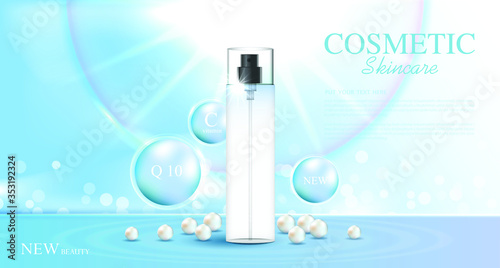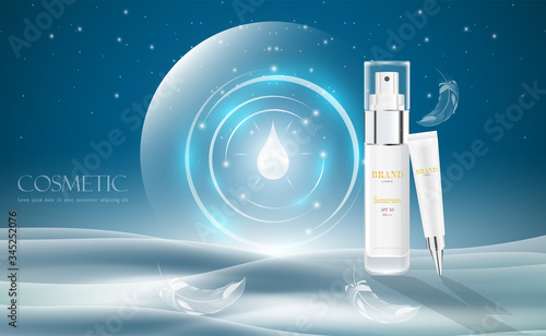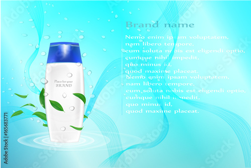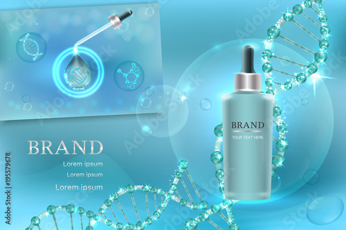 Kosmetické výrobky ad. Vektorové 3D ilustrace. Design šablony láhve pro péči o pleť. Obličej a tělo tvoří krém a krém.