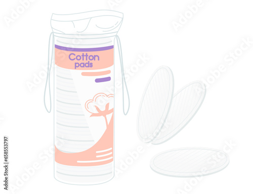 Kosmetické kola, organické bavlněné podložky pro make-up odstranění balení maketa set, vektorové ilustrace. Měkké a čisté podložky na čištění obličeje.