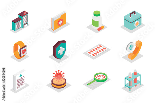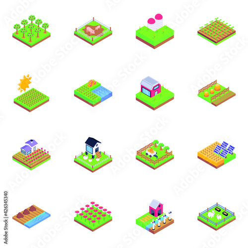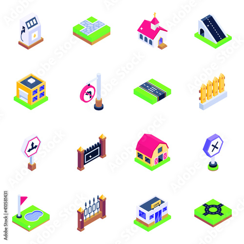 Kroky výstavby chaty. Vektorové izometrické ilustrace třídění stránek, instalatérství a odvodnění, nastavení základů, zastřešení, instalace zábalu, rámování, Opláštění, okna a dveře a připravený dům.