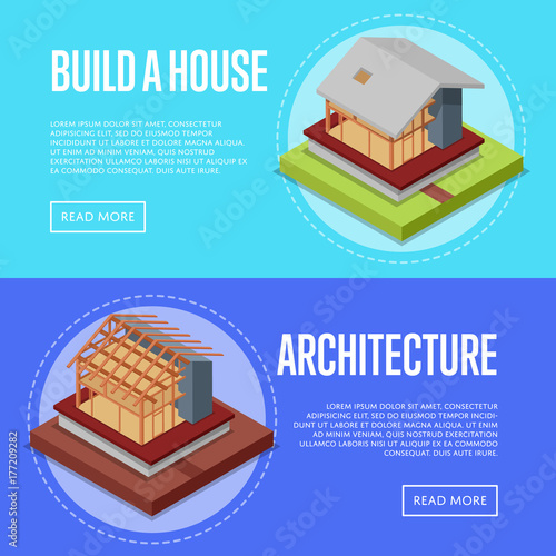 Chata konstrukce vektorové ploché izometrické horizontální banner set. Nastavení základů, rámování a zastřešení, připravené k pohybu v prvcích koncepčního designu, šablonách webových stránek.