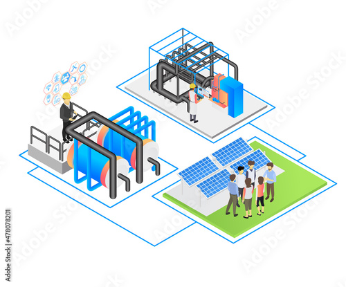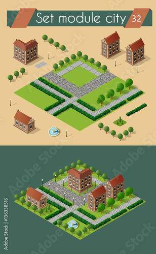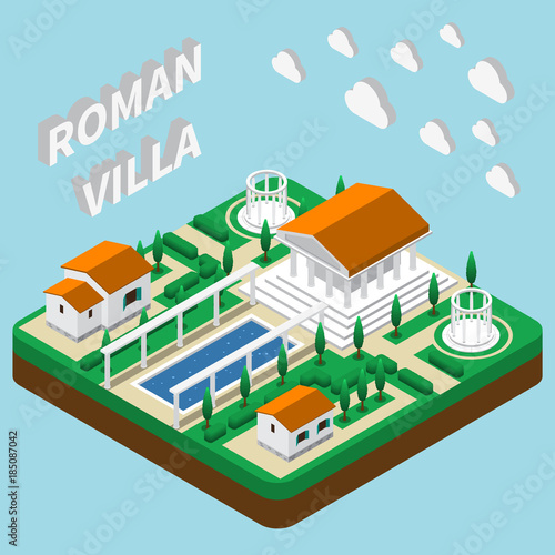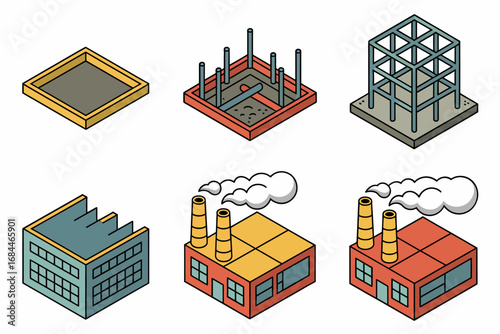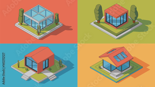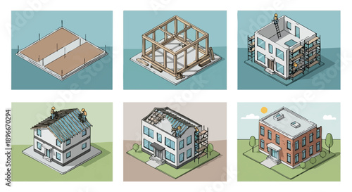 Chata konstrukce vektorové ploché izometrické plakát, banner set. Základy, rámování, zastřešení, okna a dveře designové prvky.