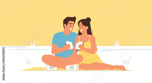Pár použití opalovací krém olej na pláži ploché kreslené vektorové ilustrace. Muž a žena na dovolené u moře péče o pokožku na ochranu těla před sluncem. Přítel a přítelkyně opalování