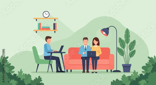 Pár výběru domu ke koupi. Realitní koncept vektorové ilustrace. Realitní agent nabízí nemovitost k prodeji. Broker pomáhá lidem nákup nebo pronájem domu.