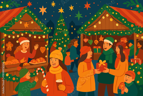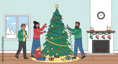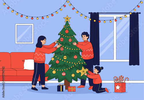 Pár zdobení vánoční strom s ornamenty a girlandami. Šťastná rodina se připravuje na oslavu Nového roku 2022. Barevné vektorové ilustrace v ručně kresleném stylu.