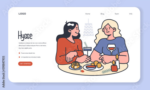 Pár má romantickou večeři doma, pít víno s dortem. Žena vařit palačinky se sirupem v domácí kuchyni. Koncept ilustrace. Vektor web design šablony. Vstupní stránka webové stránky ilustrace.