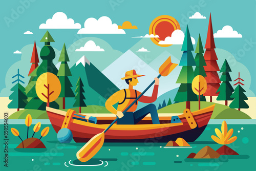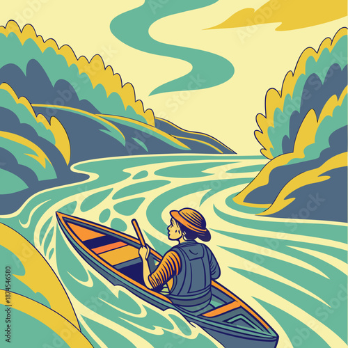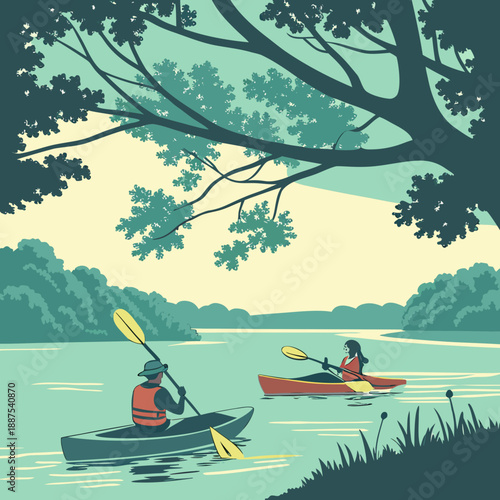 Pár na kajaku veslování dolů k řece při západu slunce. Vodní dobrodružství sport vektor plakáty set. Muž a žena rafting, jízda na kajaku, kanoistika, držení pádla. Přírodní krajina.