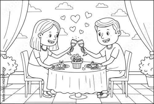 Milující pár pití vína při odpočinku v restauraci se těší čas společně s romantické chodit s někým nebo slaví Valentýna dovolenou vektorové ilustrace