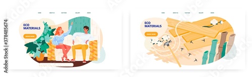 Pár sedí na pohovce v moderním designu ekologicky šetrný interiér. Home Eco materiály koncept ilustrace. Vektorová šablona. Dřevěné prkno, kladivo, bambusové hole. Domácí interiér s přírodními materiály.