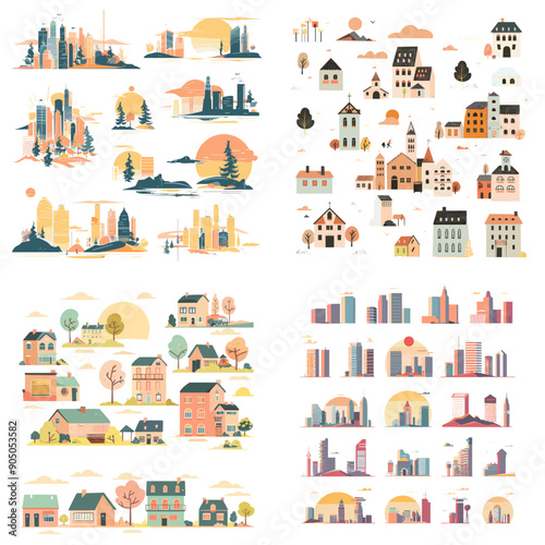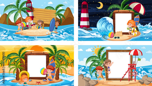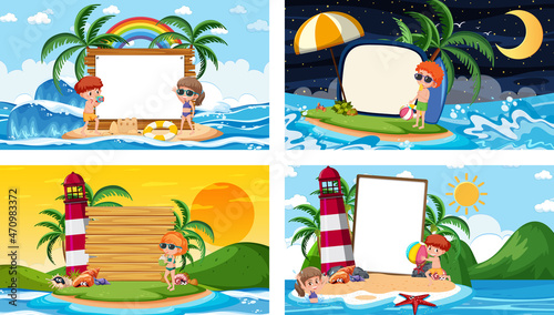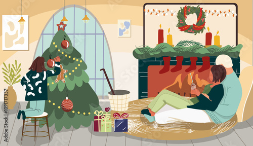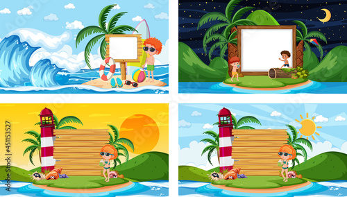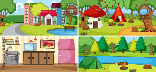 Pár sedí vedle stanu a sleduje hvězdnou noc. Letní tábor dovolená vektorové plakáty set. Horská a lesní krajina se stany. Kempinkové vybavení. Dobrodružství, Příroda, táborák.