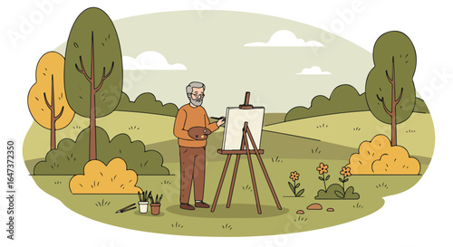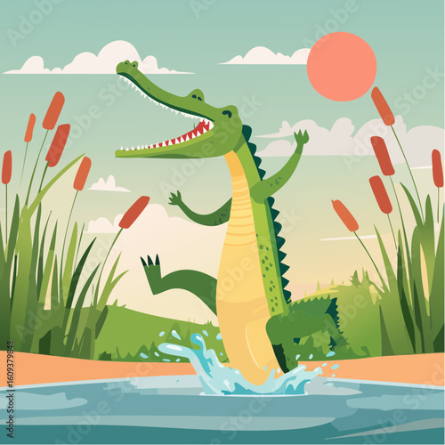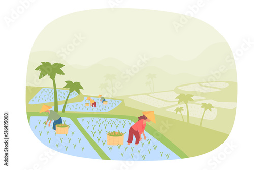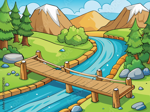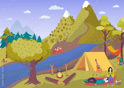 Pár trekking v horách a přechod řeky. Cestovní dobrodružství a turistika koncept vektorový plakát. Muž a žena s batohem ve venkovní přírodě landcape.