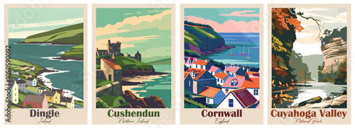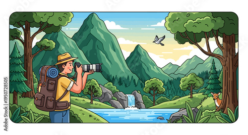 Pár trekking v horách. Cestovní dobrodružství a turistické koncepce vektorové plakáty. Lidé lezou na hory. Muž a žena s batohem ve venkovní přírodě landcape. Trekking boot detailní pohled.