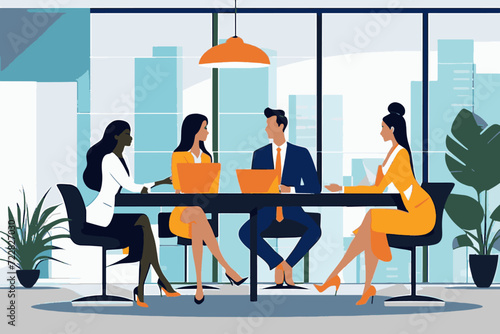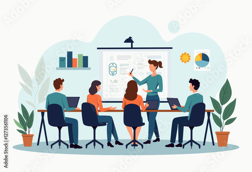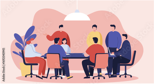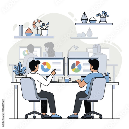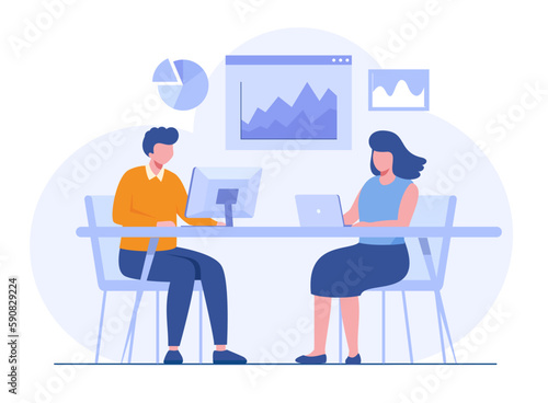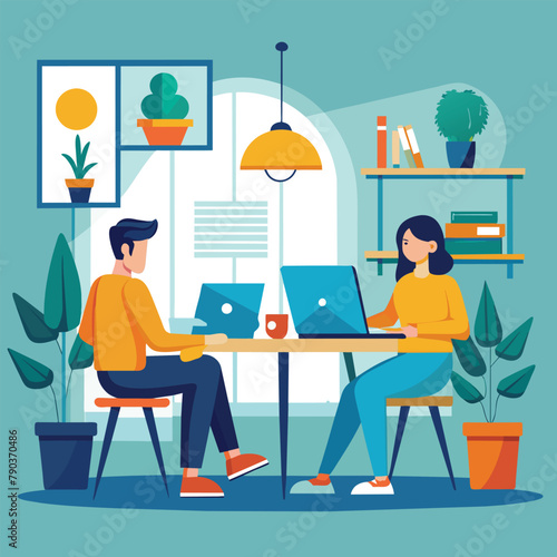 Muž a žena na volné noze v coworking business center, vektorový plochý styl designu ilustrace. Moderní coworkingový prostor pro práci na dálku s postavami pracujícími na noteboocích, s přestávkou na kávu.