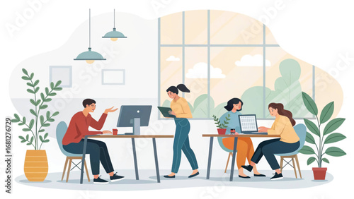 Coworkingové centrum, koncept týmové práce vektorová ilustrace v plochém stylu. Spolupracovníci, kolegové postavy využívající notebooky a sluchátka.