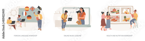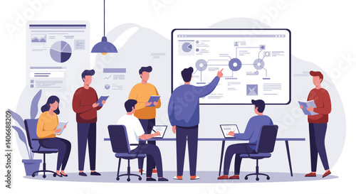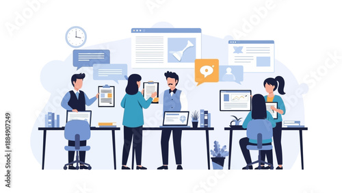 Coworking prostor scéna set, plochý vektor izolované ilustrace. Obchodní kancelářské centrum pro nezávislé pracovníky, vzdálené týmy. Lidé mluví, pracují, pijí kávu, pořádají schůzky a sdílejí otevřený společný prostor.