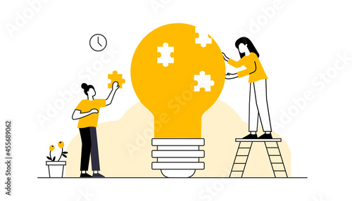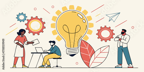 Vektorová ilustrace velkého statistického panelu a malých lidí interagujících s grafy, držících žárovku, křičících megafonem. Kancelářské práce, coworkingové koncepty pro webový banner, webové stránky atd.