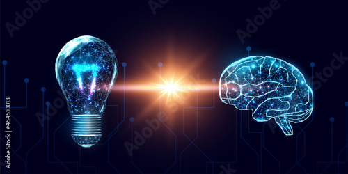 Lidská hlava s žárovkou uvnitř, vektorové nízké poly drátěné pletivo. Kreativní mysl mozek nápad myšlení koncept pro plakát, banner atd., ilustrace polygonálního uměleckého stylu.