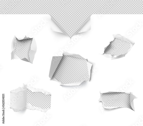 Kreativní papír cut craft styl rám set, vektorové ilustrace. Realistická díra roztrhaná v listu papíru. Roztrhaný papír s roztrhanými okraji.
