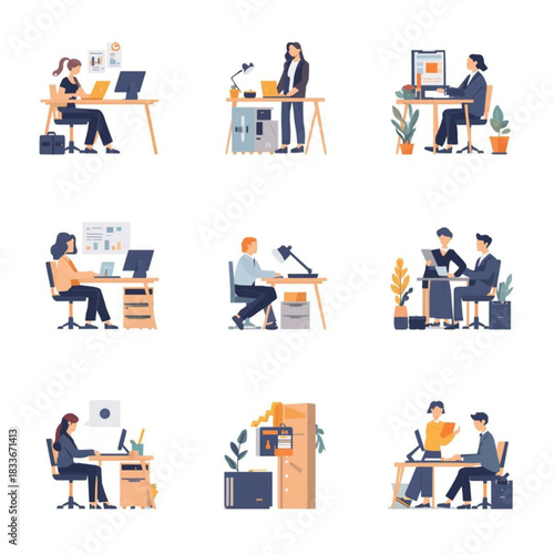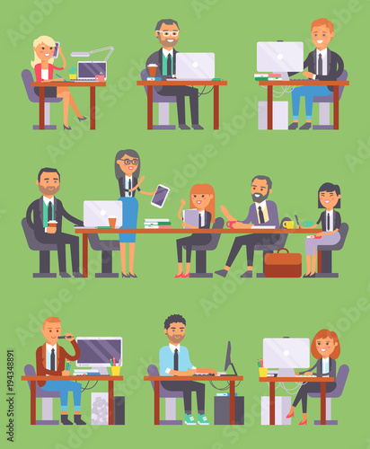Vektorová ilustrace kreativního ředitele a jeho týmového programátora, tvůrce, vývojáře webových stránek, grafického designéra. Kreativní tým lidí symboly, ikony izolované na bílém pozadí. Plochý design.