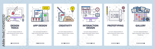 Kreativita a design ikony, kreslení, malování, paleta barev, fotoalbum, prototypování. Mobilní aplikace onboarding obrazovky. Vektorová šablona banneru pro vývoj mobilních webových stránek. Ilustrace webových stránek