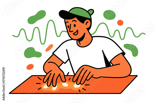Krize kreativity. Smutný hudebník kytarista sedí na trávě s tužkou a písněmi noty v rukou, ploché vektorové ilustrace. Kreativní krize a syndrom vyhoření, deprese, psychický stres.