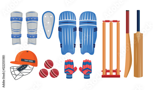 Sada kriketových her, vektorové izolované ilustrace. Kriket hráč vybavení a ochranné pomůcky. Realistická pálka, rukavice, helma, chrániče nebo podložky sázkových nohou, míč, pařez, pohár, sportovní taška.