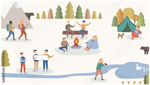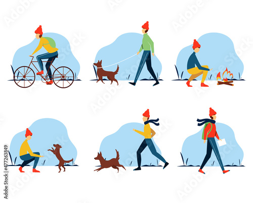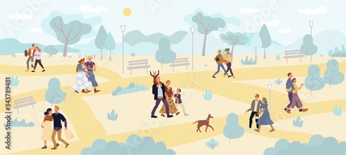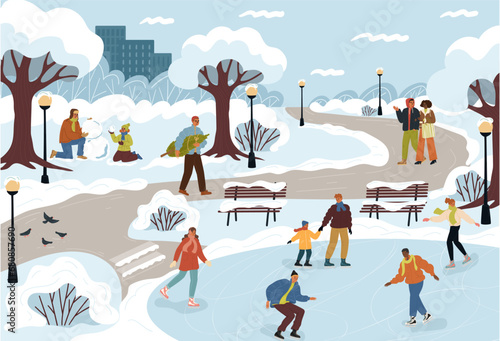 Dav lidí tráví čas v winter park vektorové ilustrace. Pár, rodiče s dětmi postavy chůze, dělat sněhuláka, nesoucí vánoční jedle, bruslení spolu
