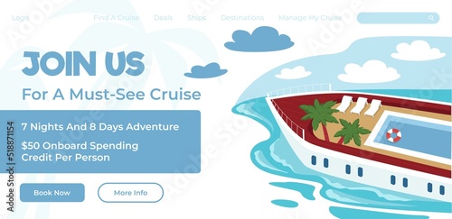 Šablona webových stránek výletní lodi, design webových stránek a vstupních stránek pro vývoj webových stránek a mobilních stránek. Izometrická výletní loď na mapě světa s lokalizačními kolíky. Cestování po moři, koncept plavby.