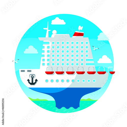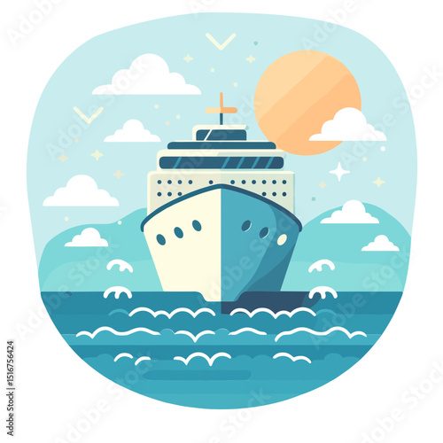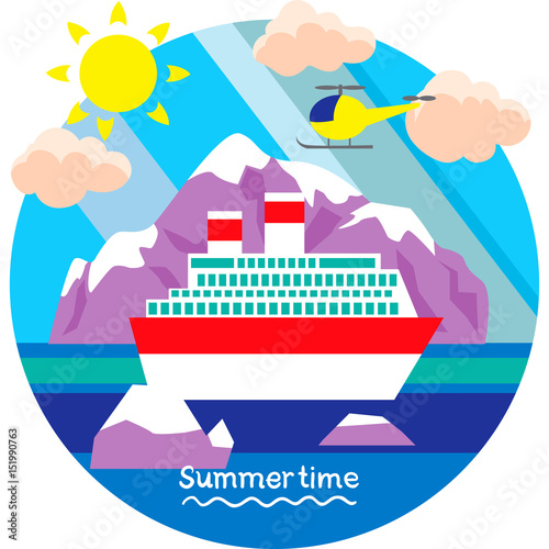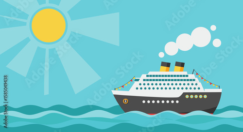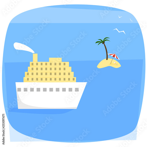 Cruise čas Vektorové papír snížit ilustrace. Výletní loď plovoucí na oceánských vlnách, delfínech, raccích, ostrovech, turistických střediscích. Plavba po moři, letní plavba.