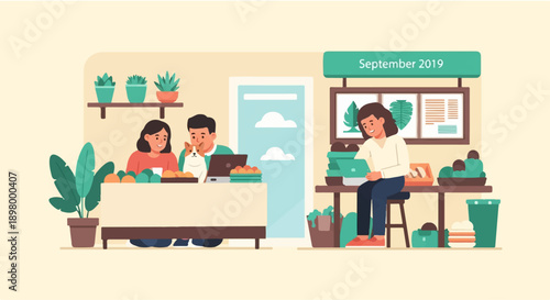 Mužské a ženské postavy vařit bloggerů vaření jídla společně v kuchyni, vektorový plochý styl designu ilustrace. Food hunter, kuchař kurzy on-line, kulinářské blog internetový kanál.