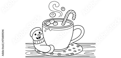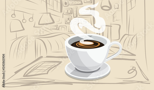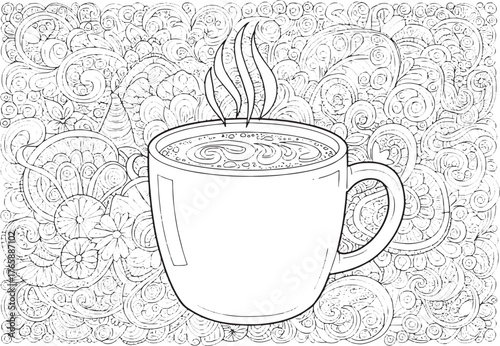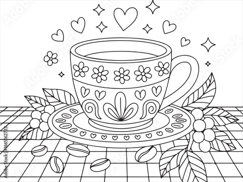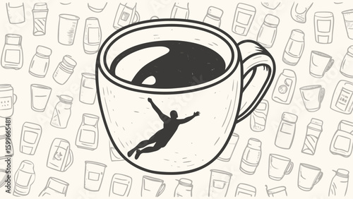 Vektor realistický pohled shora šálek černého čaje s ručně tažené doodle čajové předměty kolem něj. Skica vintage čajový set.