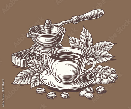Vektor realistický pohled shora šálek kávy s náčrtem sladkosti kolem něj. Doodle kobliha, dort, košíček, croissant a kávové nápoje. Skica vintage káva pozadí.