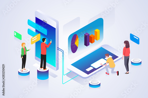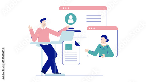 Akvizice zákazníků ploché kreslené vektorové ilustrace. Přitažlivost klienta, doporučení příchozí digitální marketing a propagační strategie. Influencer se značkou magnet zve přátele na přenosný počítač