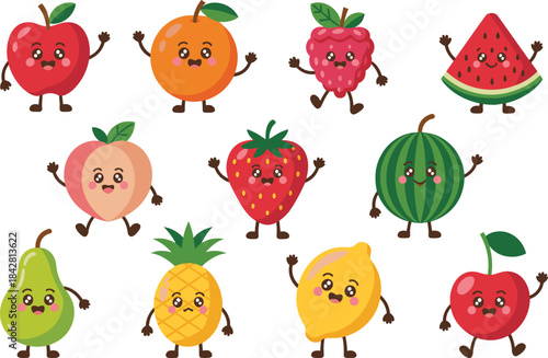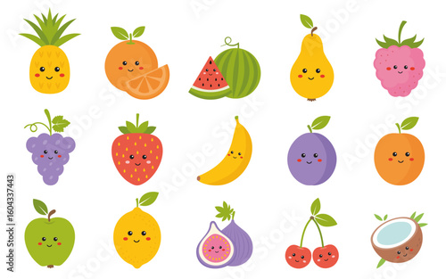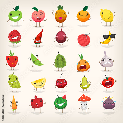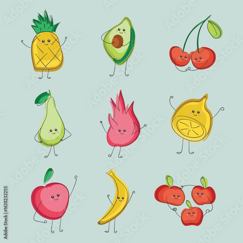 Roztomilé a vtipné ovoce znaková sada, ploché vektorové ilustrace. Letní ovoce a bobule. Happy cartoon cherry, meloun, švestka, banán, jablko, citron, hruška, jahoda, avokádo, ananas s tvářemi.
