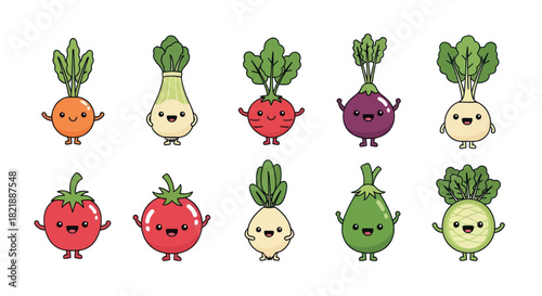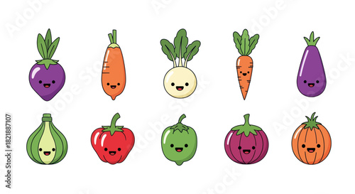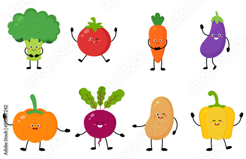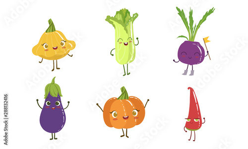 Roztomilá a zábavná zeleninová znaková sada, ploché vektorové ilustrace. Šťastný kreslený kohlrabi, brokolice, kukuřice, cibule, mrkev, rajče, okurka, dýně, česnek, červená paprika s tvářemi. Zdravé jídlo.