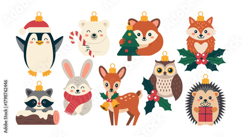 Roztomilá zvířata v lásce vektorové ilustrace izolovaných na bílém pozadí. Šťastná liška, medvěd, sova, mýval, veverka, jelen, ježek a zajíc drží srdce, dort, balónky a květiny.
