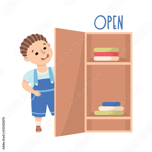 Roztomilý chlapec dítě uvedení složené oblečení v šatníku, pomáhá rodičům s úklidem domu, ploché vektorové ilustrace. Děti domácí práce a odpovědnost.