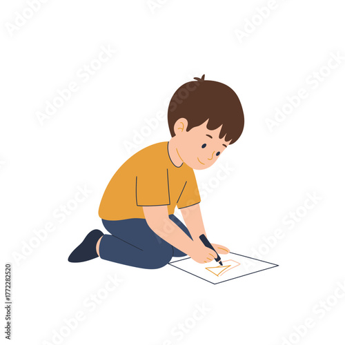 Roztomilý chlapec zametání podlahy s koštětem, pomáhá rodičům s úklidem domu, ploché vektorové ilustrace. Děti domácí práce a odpovědnost.