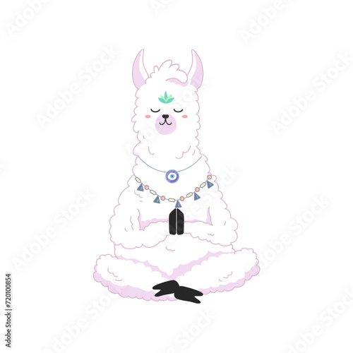Roztomilý kreslený lamas alpaky meditující v lotosové józe představují vektorové ilustrace izolovaných na bílém pozadí. Koncept meditace, všímavosti a úlevy od stresu