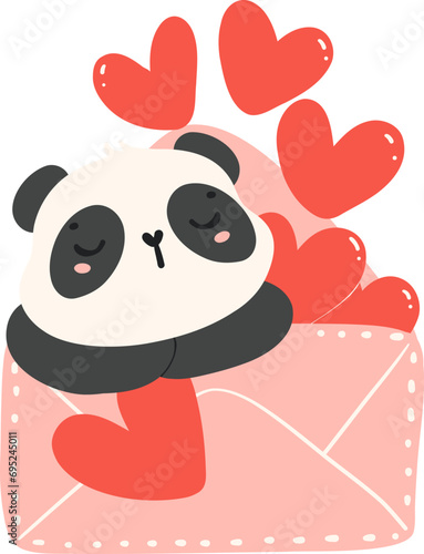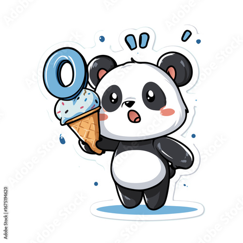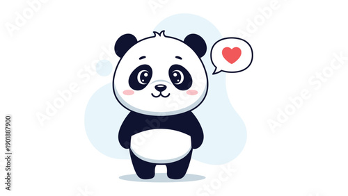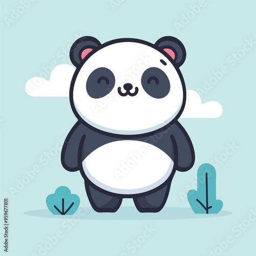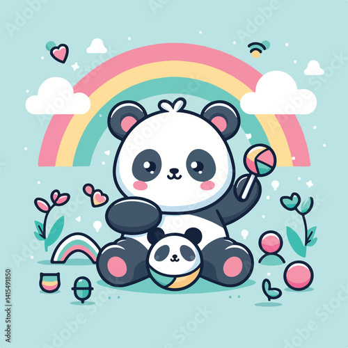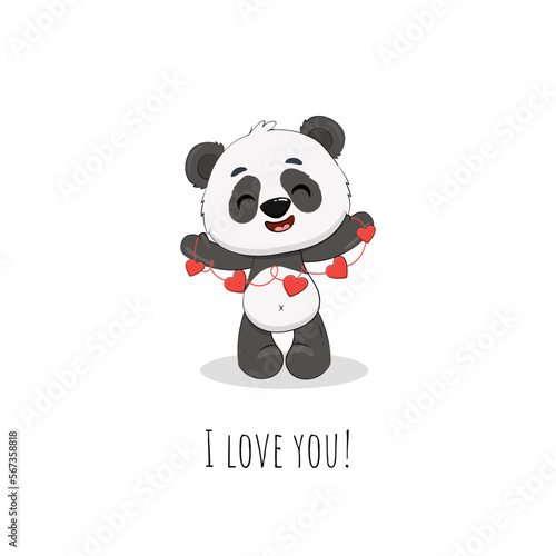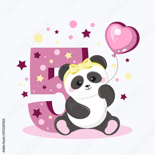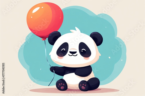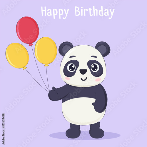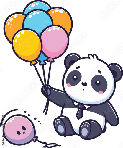 Roztomilý kreslený panda vektor. Ikona medvědí zvíře. Legrační holčička mládě charakter s šťastný obličej běží drží balón izolovaných na bílém pozadí