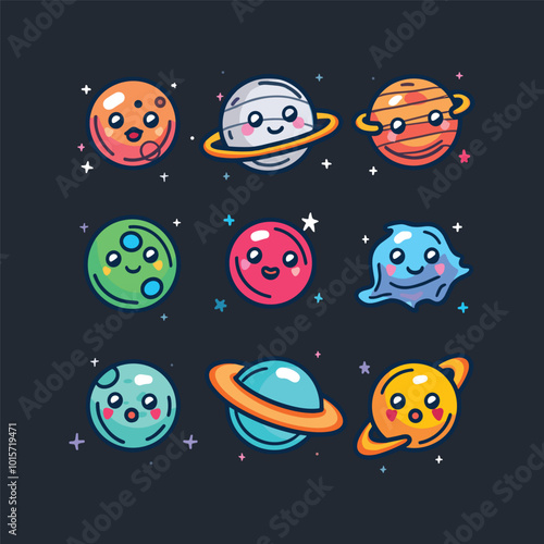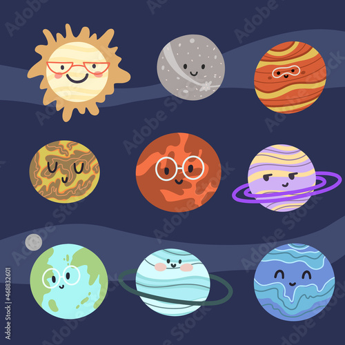 Roztomilý kreslený planety sluneční soustavy. Papír řez Uran Neptun Merkur Venuše Mars Jupiter Saturn Země Slunce Měsíc s úsměvem tváře, vektorové ilustrace. Legrační dětinský vesmírná planeta emoji. Děti astronomie.