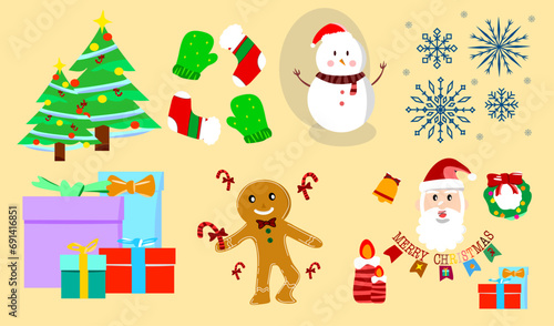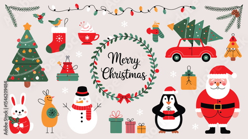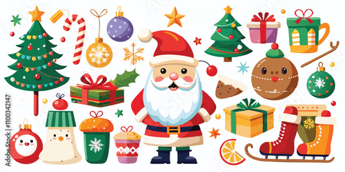 Roztomilý vánoční kočka zimní znaky izolované nastavit na bílém pozadí. Legrační kotě s vánoční dárkové krabičce a ozdoby, v blízkosti zdobené jedle, zabalené v věnec vektorové ilustrace