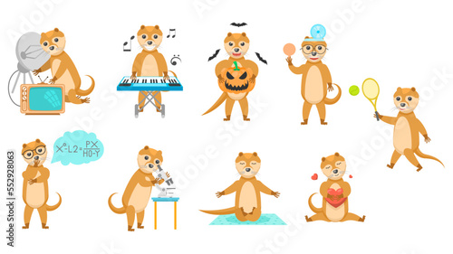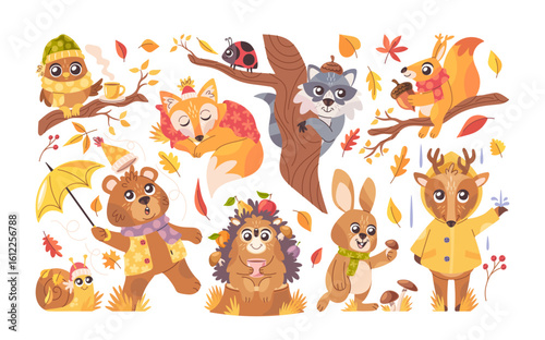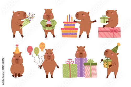 Roztomilý kráva kreslená postavička set, plochý vektor izolované ilustrace. Legrační hospodářská zvířata spí, konzumní mléko, drží láhev, kbelík, krabici na mléko. Mlékárenský průmysl, zemědělství.