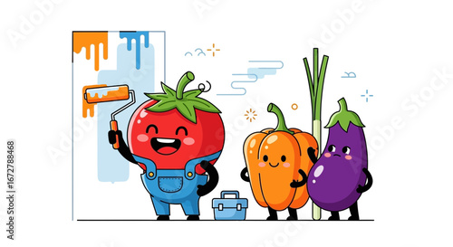 Roztomilé vtipné zeleninové postavy v salátové misce, ploché vektorové ilustrace. Šťastný kedluben, brokolice, kukuřice, cibule, mrkev, rajče, okurka, dýně, česnek, pepř s tvářemi. Čerstvé biopotraviny.