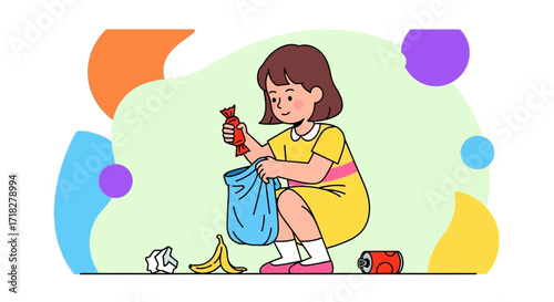 Roztomilá dívka načítání oblečení do pračky, pomáhá její máma s prádelna a úklid domu, ploché vektorové ilustrace. Děti domácí práce a odpovědnost.