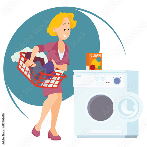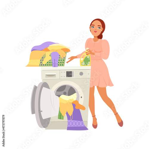Roztomilá dívka načítání oblečení do pračky, pomáhá její máma s prádelna a úklid domu, ploché vektorové ilustrace. Děti domácí práce a odpovědnost.