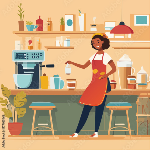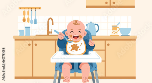 Roztomilá dívka mytí nádobí ve stoje na židli v kuchyni, ploché vektorové ilustrace. Dítě pomáhá matce dělat domácí práce. Úklid domu, úklid.
