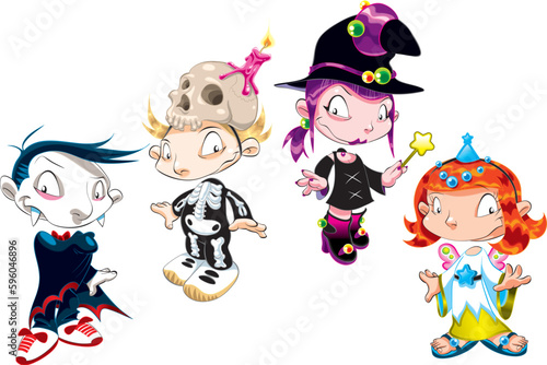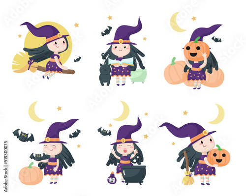 Halloween cartoon čarodějnice vektorové sada. Roztomilá šťastná holčička kouzelná postava izolovaných na bílém pozadí. Pěkná čarodějka ilustrace. Oslava říjnových svátků