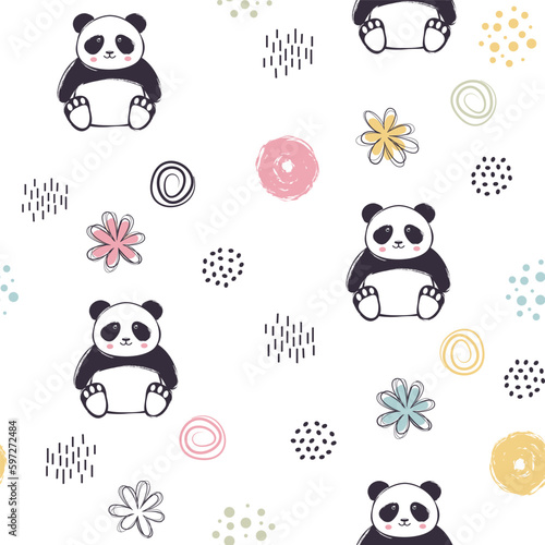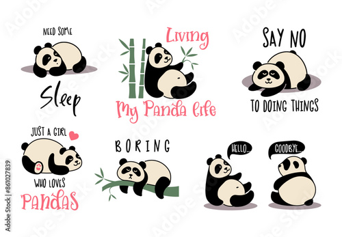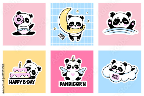 Roztomilé panda karty. Vektorové šablony sada s legrační pandy se srdíčky, balón, kobliha, bambusové listy, šálek kávy a Dobrou noc, Dobré ráno, Pěkný den, ahoj, tak roztomilé, krásné kaligrafie textu.