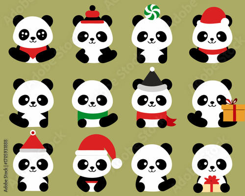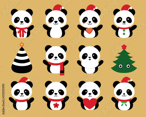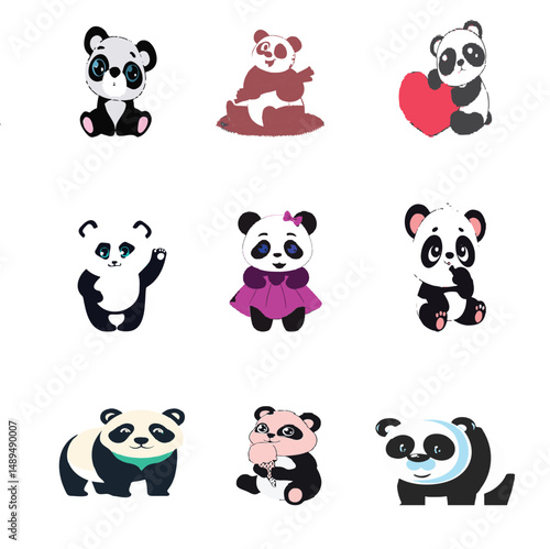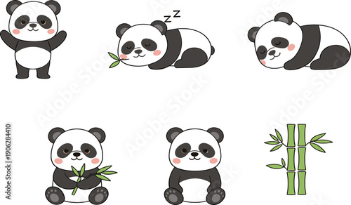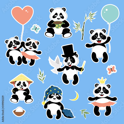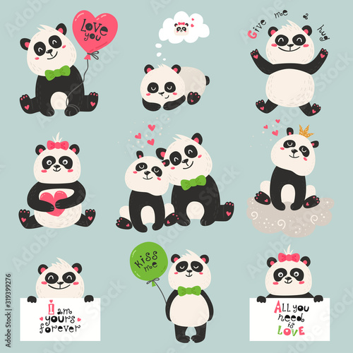 Roztomilá sada ikon panda pro přání, pozvánku, plakát, nálepku, tisk. Vektorové izolované ilustrace vtipné kreslené postavičky se srdcem, balón, šálek kávy, bambus atd.