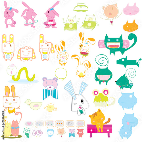 Roztomilá zvířata v zájmovém chovu odpočívají na sadě ikon na pláži. Vektorové ilustrace legrační kočky, psi a křečci se těší letní dovolenou na pláži izolovaných na bílém pozadí.